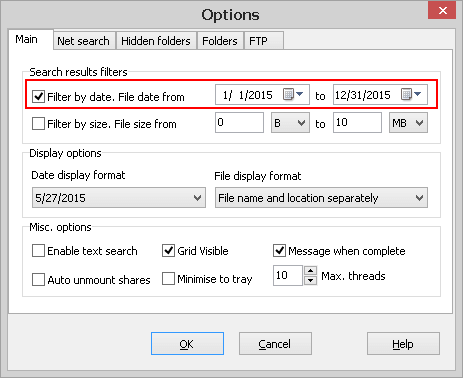 Now you must specify the time period for the files you want to find. Press Ctrl+O, set Filter by date and select the required time period: