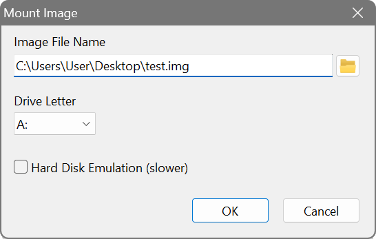 To begin working with an image file, you need to create it first by choosing Image – Create Image from the main menu. Specify the name of the image file with the full path to its location, and the size. This size should not exceed the amount of RAM that you can dedicate to a RAM disk, because the size of the image determines the size of the RAM disk based on this image. If you are planning to use hard disk emulation, select the Hard Disk image type; otherwise leave it as Volume. Optionally choose the file system and specify the volume label:
